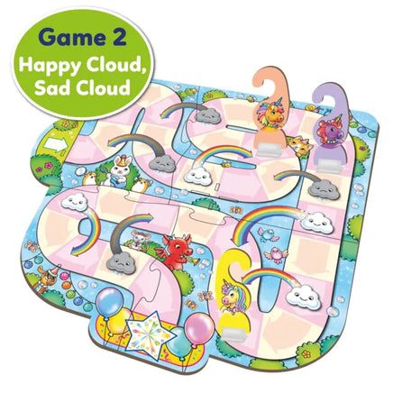Game 2: Follow the magical path climbing up happy clouds and shooting down sad clouds in this fun twist on Snakes and Ladders in Happy Cloud, Sad Cloud