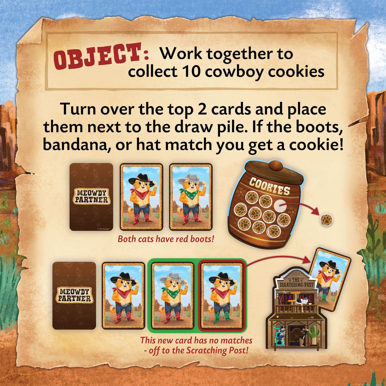 Perfect for preschoolers and kindergarteners, Meowdy Partner encourages kids to work together as they match attributes on cowboy cat cards and collect a cowboy cookie for each match.