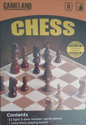 Chess set with wooden Staunton pieces. Folding board opens to 36.5cm square.